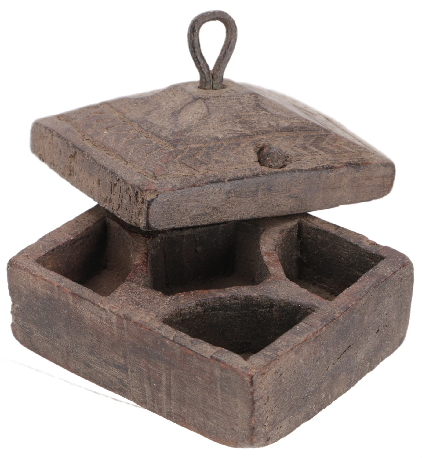 Diese Schachtel wurde im 19. Jahrhundert aus einem Stück Teakholz gefertigt. Die Wände sind nicht eingesetzt, sondern aus dem Holz geschlagen. Der Deckel ist mit einem Metallstift befestigt und wird zur Seite gedreht. Diese Boxen dienen traditionell für die Herstellung und Aufbewahrung einer leuchtend rote Paste, die dazu verwendet wird, mit dem Finger einen Punkt auf die Stirn zu tupfen. Diese Punkte sind als Bindi bekannt und werden als ein Zeichen des Schutzes von Hindus getragen.