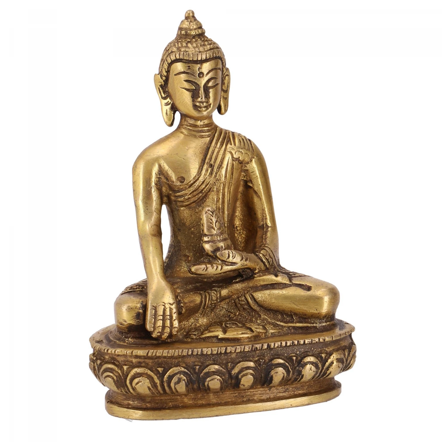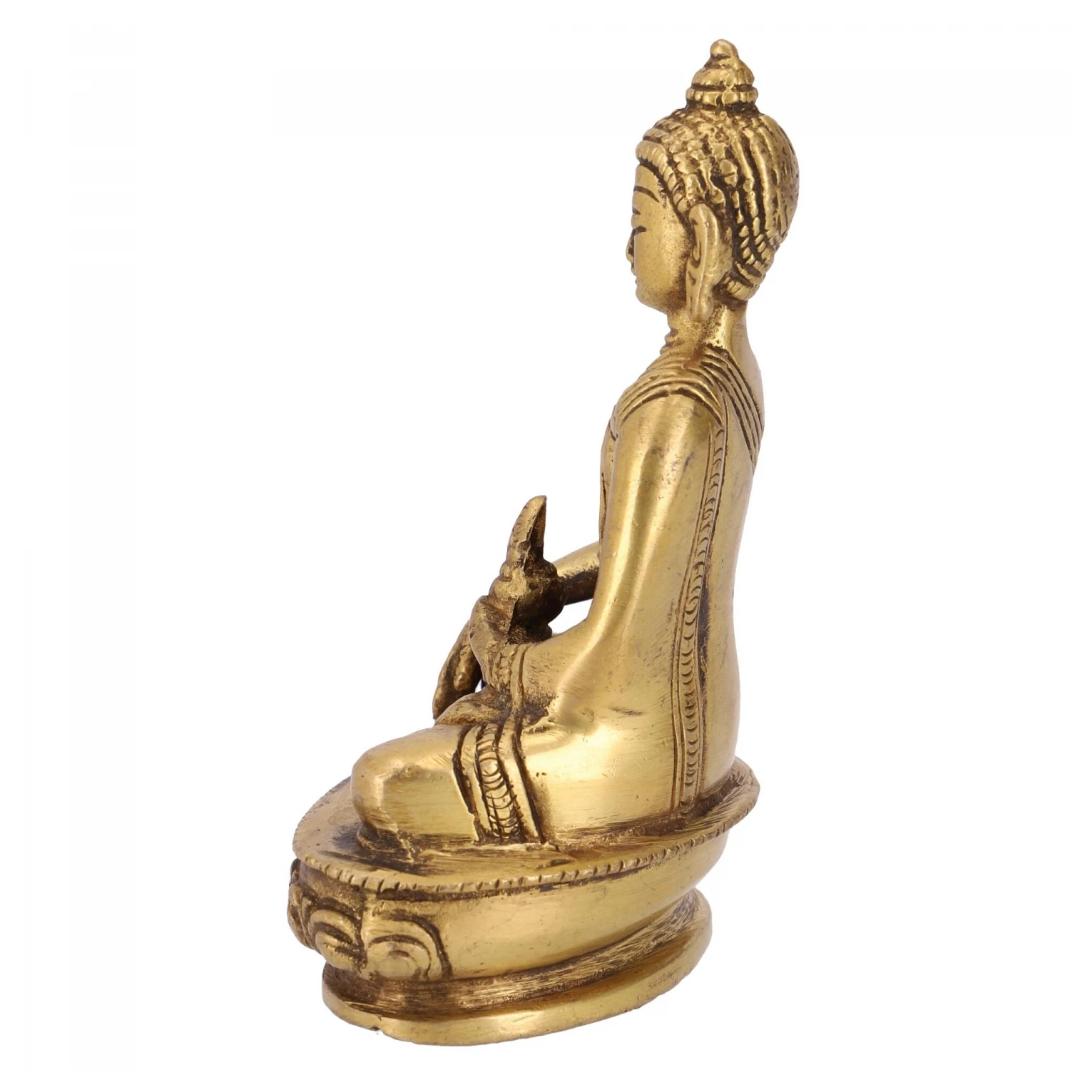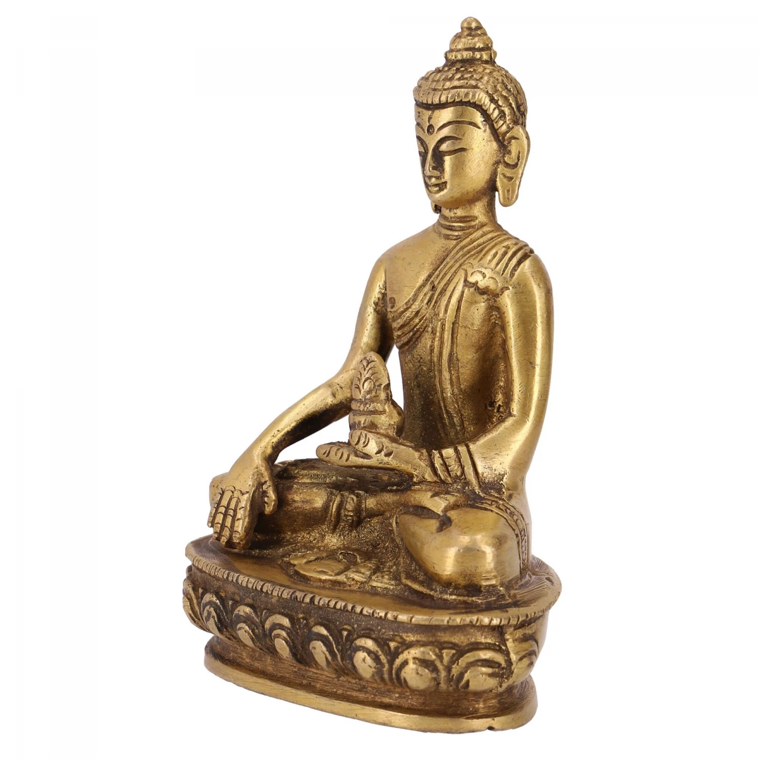 Seine Rechte Hand berührt im Busparsa-Mudra die Erde während seine linke den Almosentopf hält.