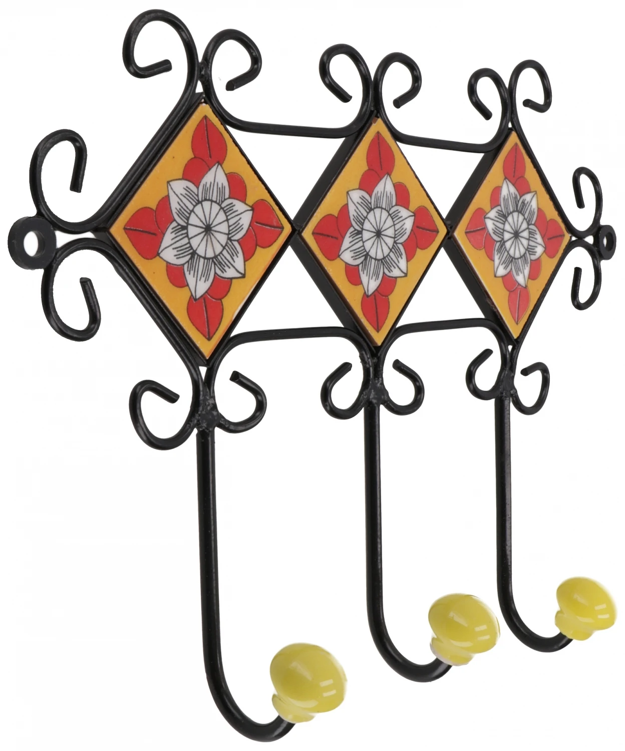 Farbenfrohe, traditionel gefertigte Fliesen in Kombination mit feiner Schmiedearbeit zu einer dekorativen vielseitig einsetzbaren Hakenleiste verarbeitet.