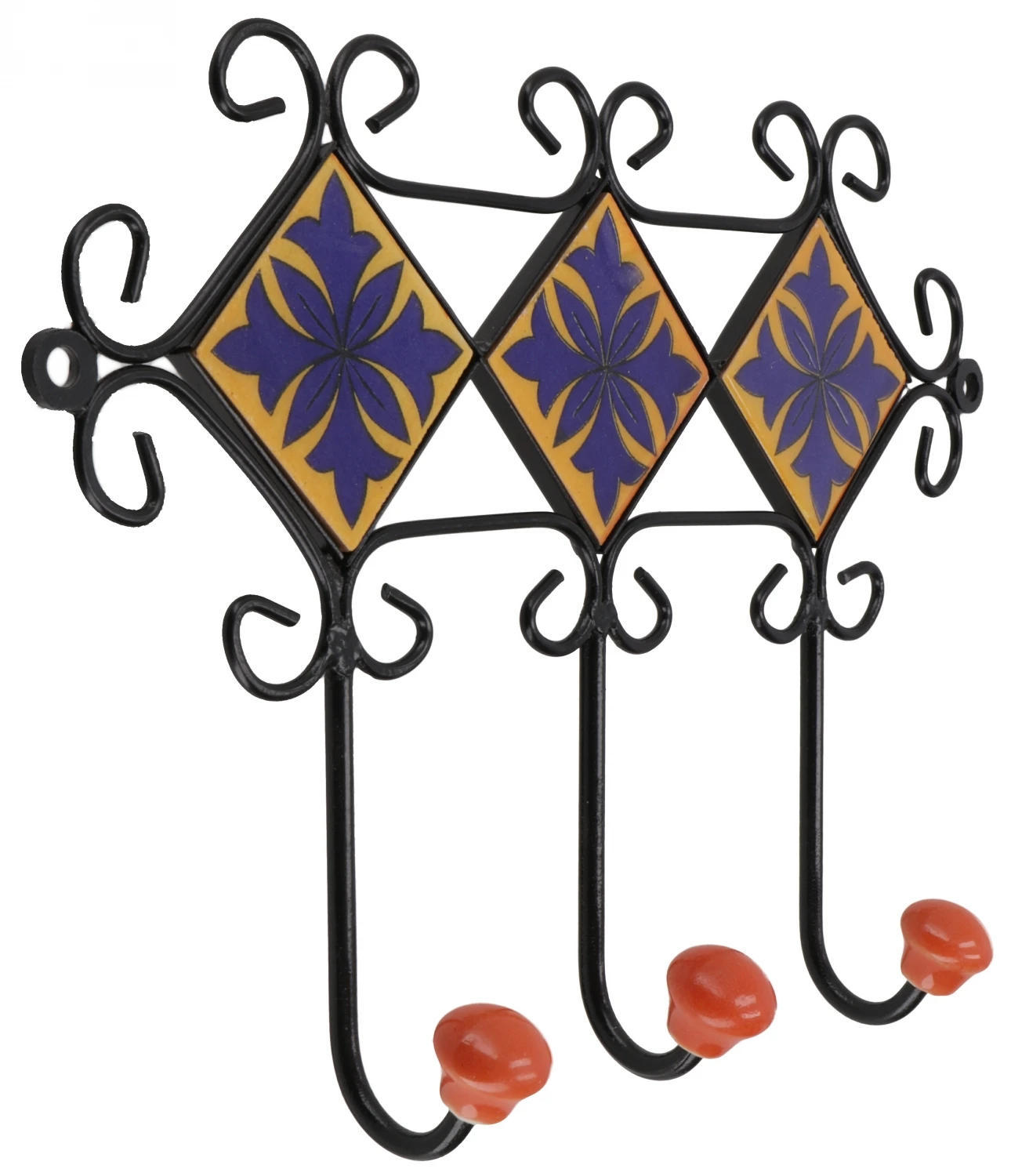 Farbenfrohe, traditionel gefertigte Fliesen in Kombination mit feiner Schmiedearbeit zu einer dekorativen vielseitig einsetzbaren Hakenleiste verarbeitet.