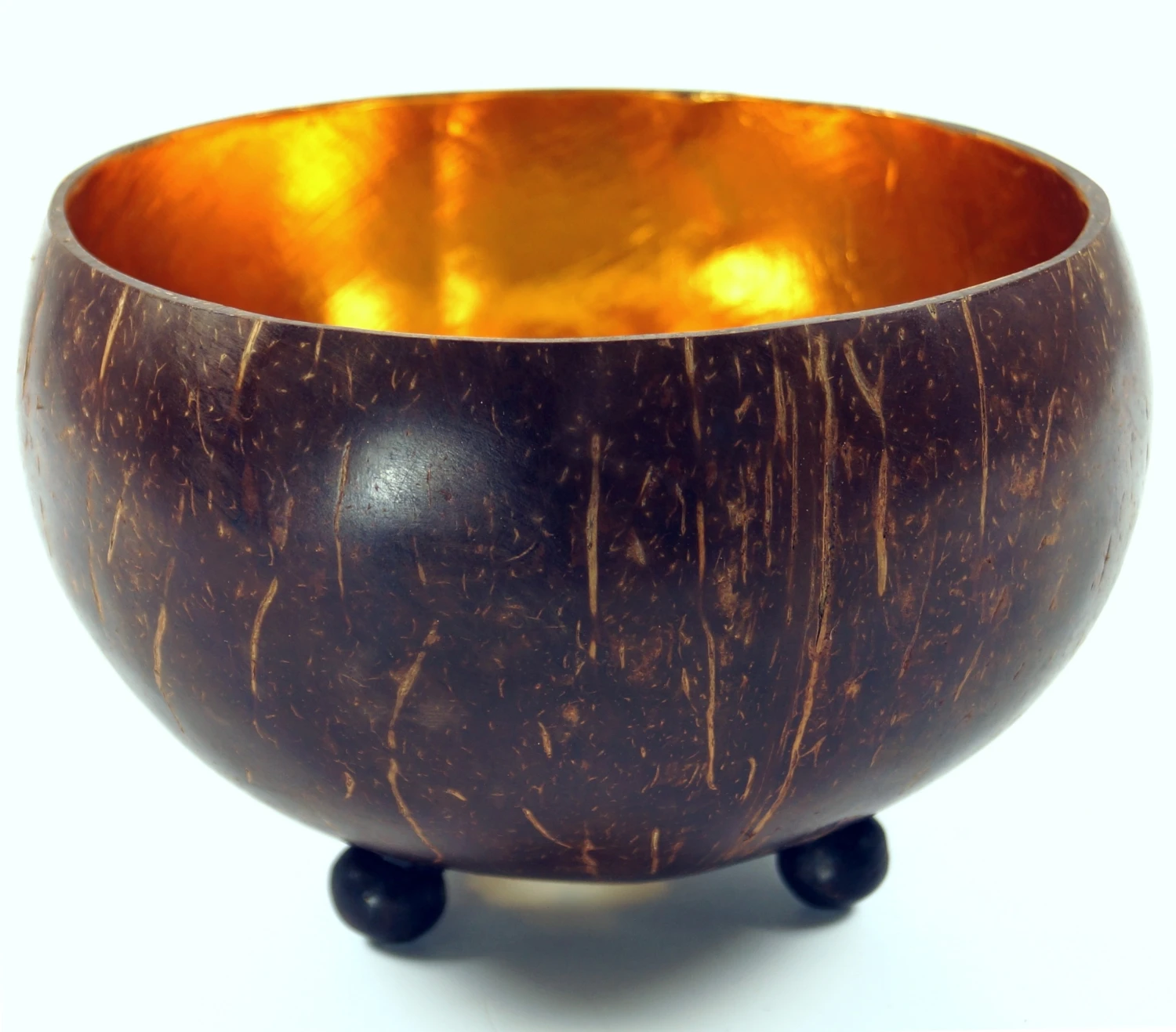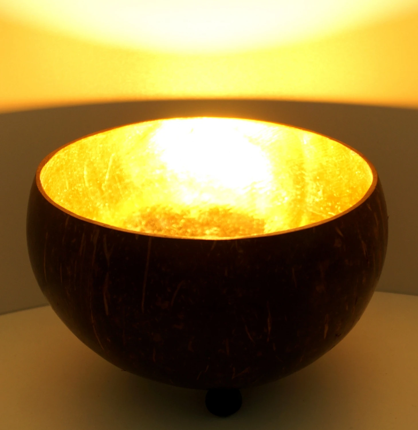 Mit diesem schönen Teelichthalter freut man sich auf gemütliche Stunden bei stimmungsvollem Licht. Das Windlicht aus einer Kokosnuss ist mit goldfarbener Folie ausgekleidet. Die schönen eingeschnitzten Ornamente ergeben ein wunderbares Lichtspiel.