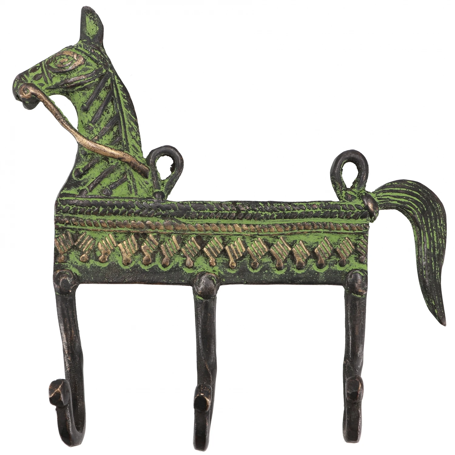 Filigran Verzierter 3`er Messing Wandhaken, Wandgarderobe, Schlüsselhalter, Kleiderhaken – Pferd / Antikgrün – 14x14x3,5 Cm