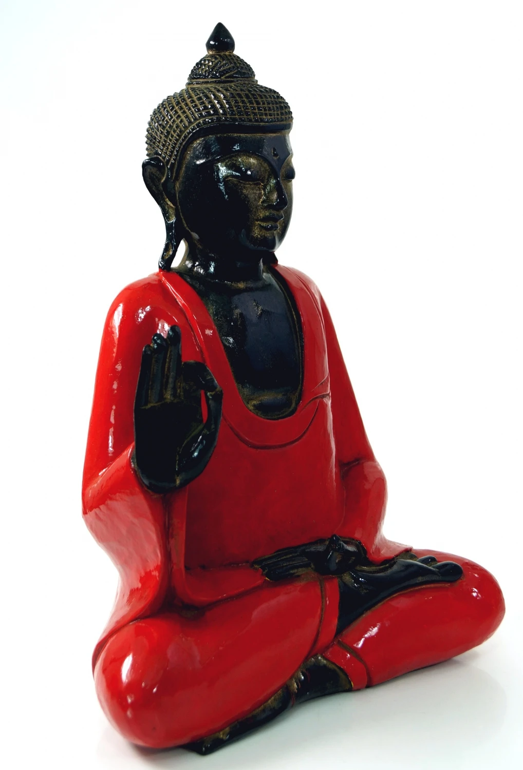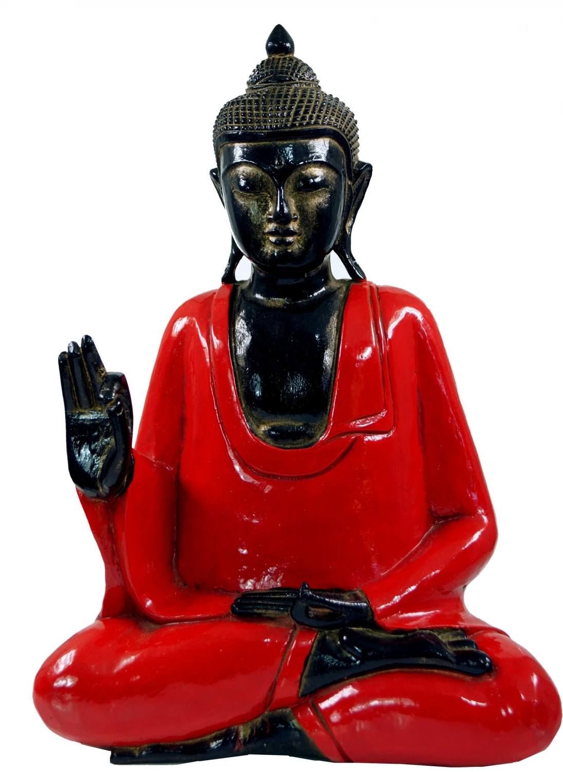 Der Buddha steht für die eigene Mitte, für Meditation und Erleuchtung. Aus der Kraft des Inneren werden Weisheiten und Kräfte geschöpft, die helfen, das eigene Leben positiv auszurichten. Die Geste (Stellung der Hände) des Vitarka Mudras steht für die Übertragung der buddhistischen Lehre.