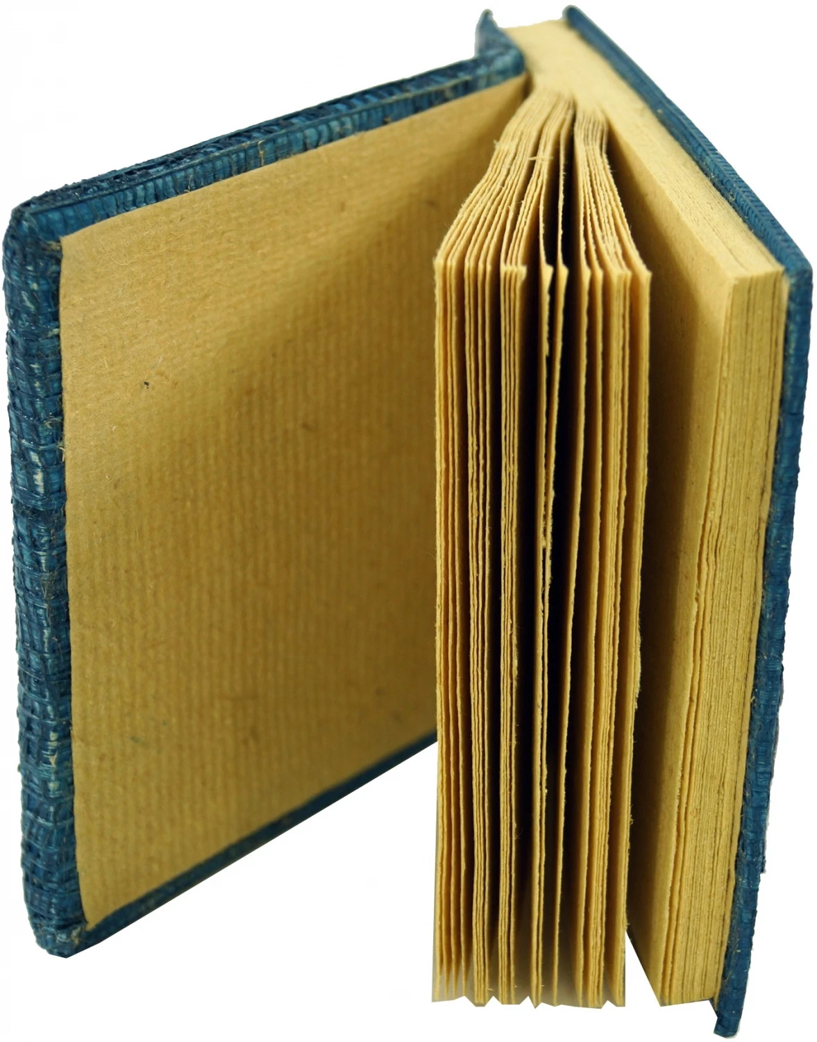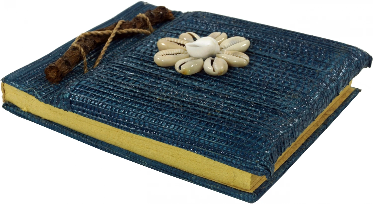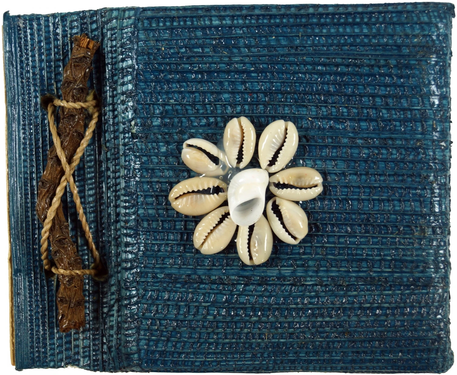 Das Buch ist in mit einem Einband aus gefärbtem Maisstroh versehen und hat eine aus Muscheln gestaltete Blüte auf dem Deckblatt.