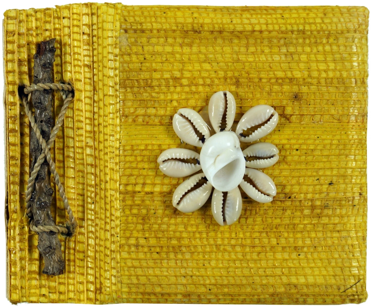 Das Buch ist in mit einem Einband aus gefärbtem Maisstroh versehen und hat eine aus Muscheln gestaltete Blüte auf dem Deckblatt.