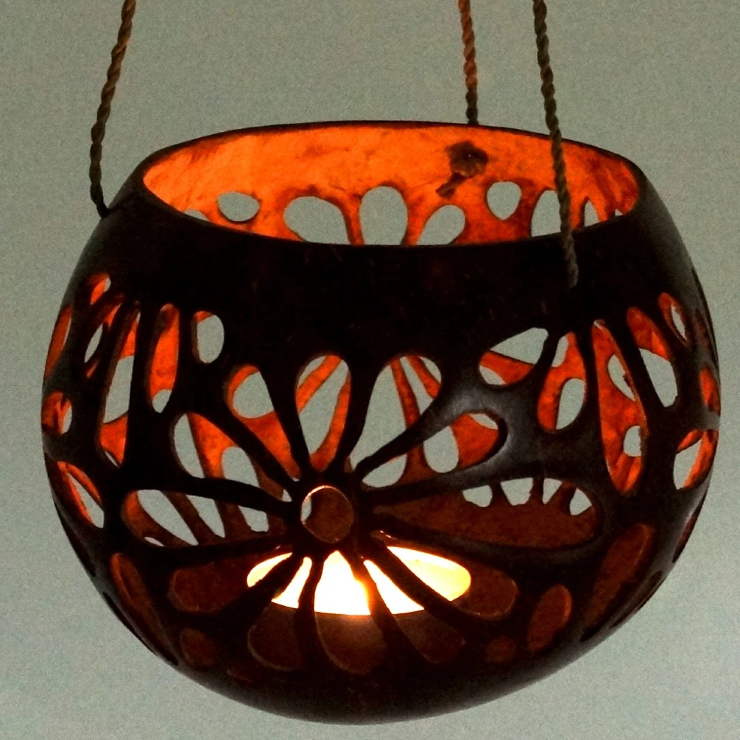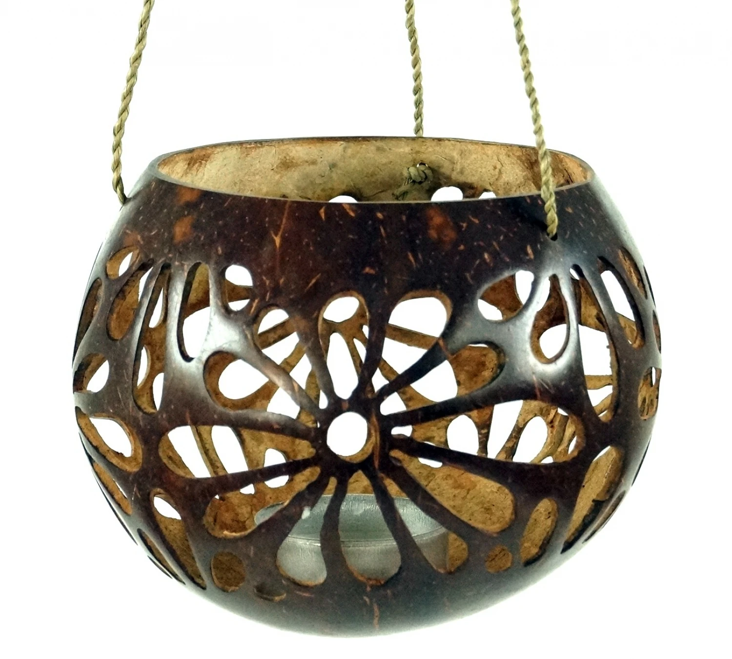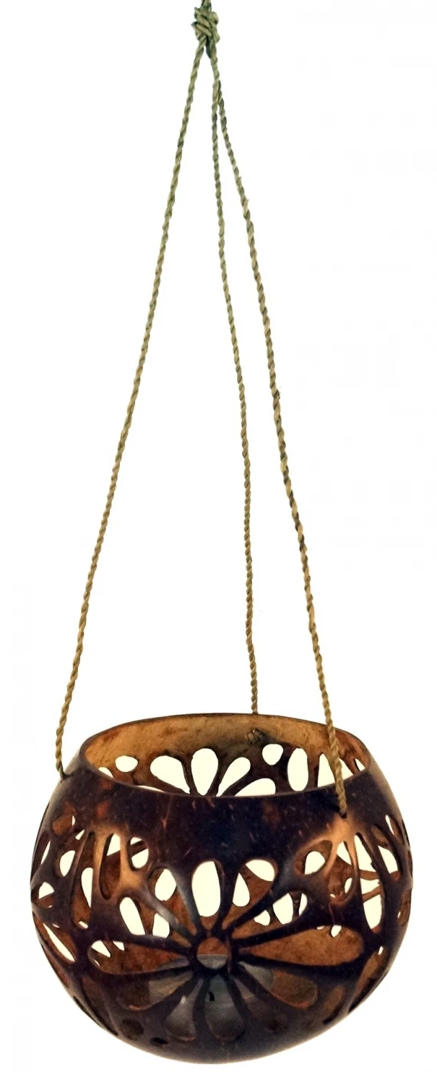 Die Ornamente wurden von Hand in die polierte Nuss geschnitten. Die Kokosnuss hat dabei ihre natürliche Form behalten, daher kann die Größe leicht variieren.
