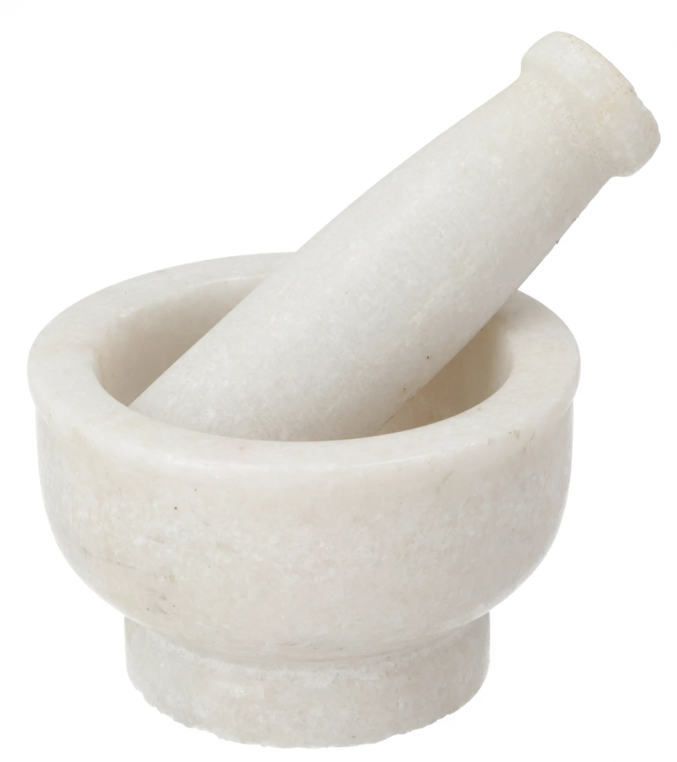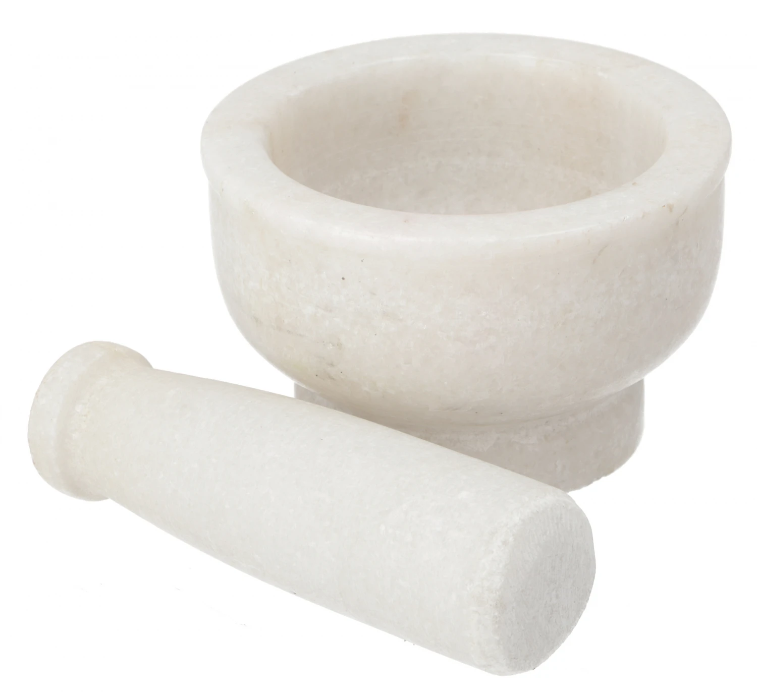 Weißer Marmor-Mörser mit Pistille aus Indien. Die Tiefe des Gefäßes beträgt 4 cm.