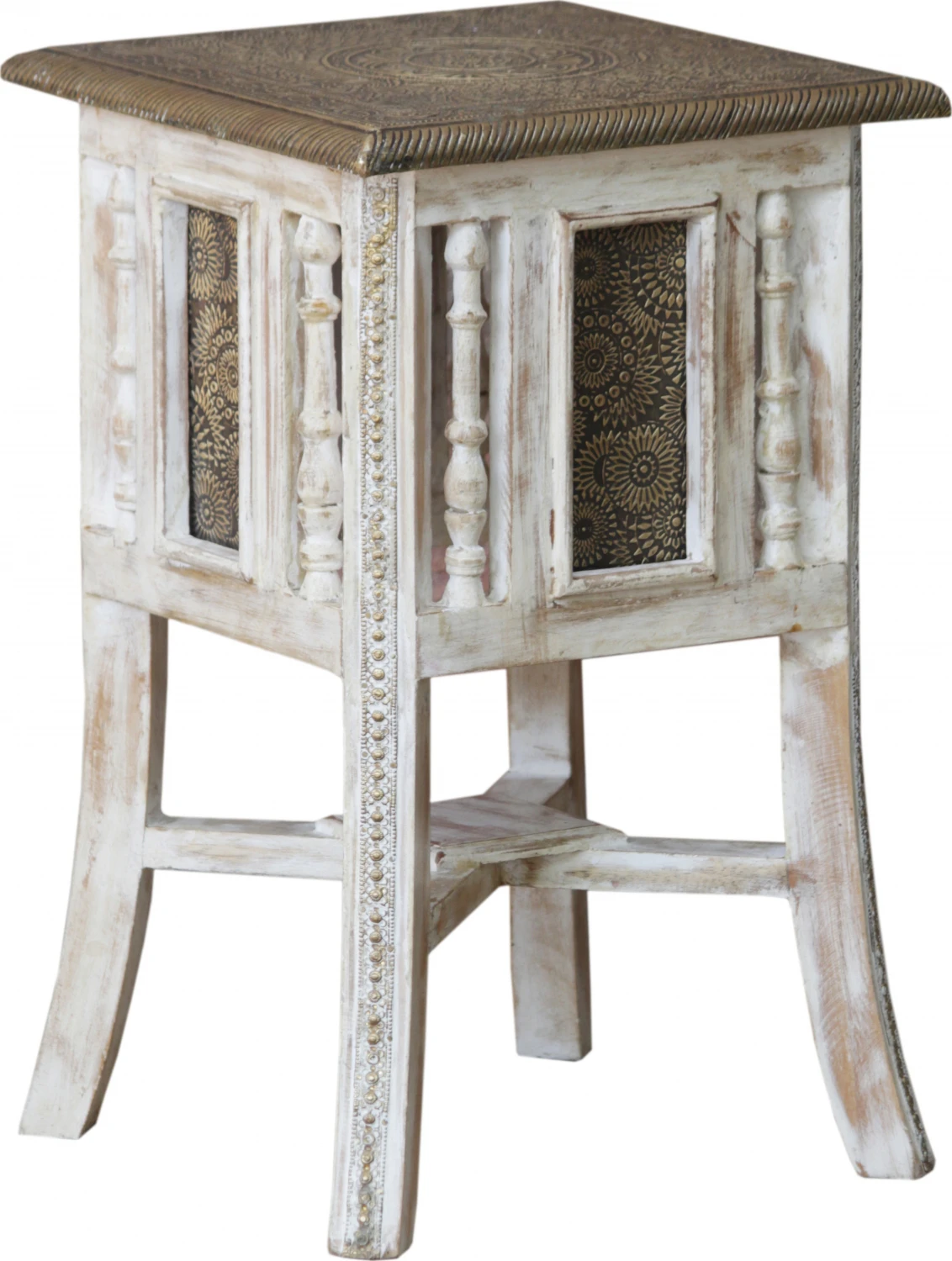 Die charakteristischen Dekoelemente aus geprägtem Messingblech machen diesen Tisch zu einem ganz besonderen Blickfang.