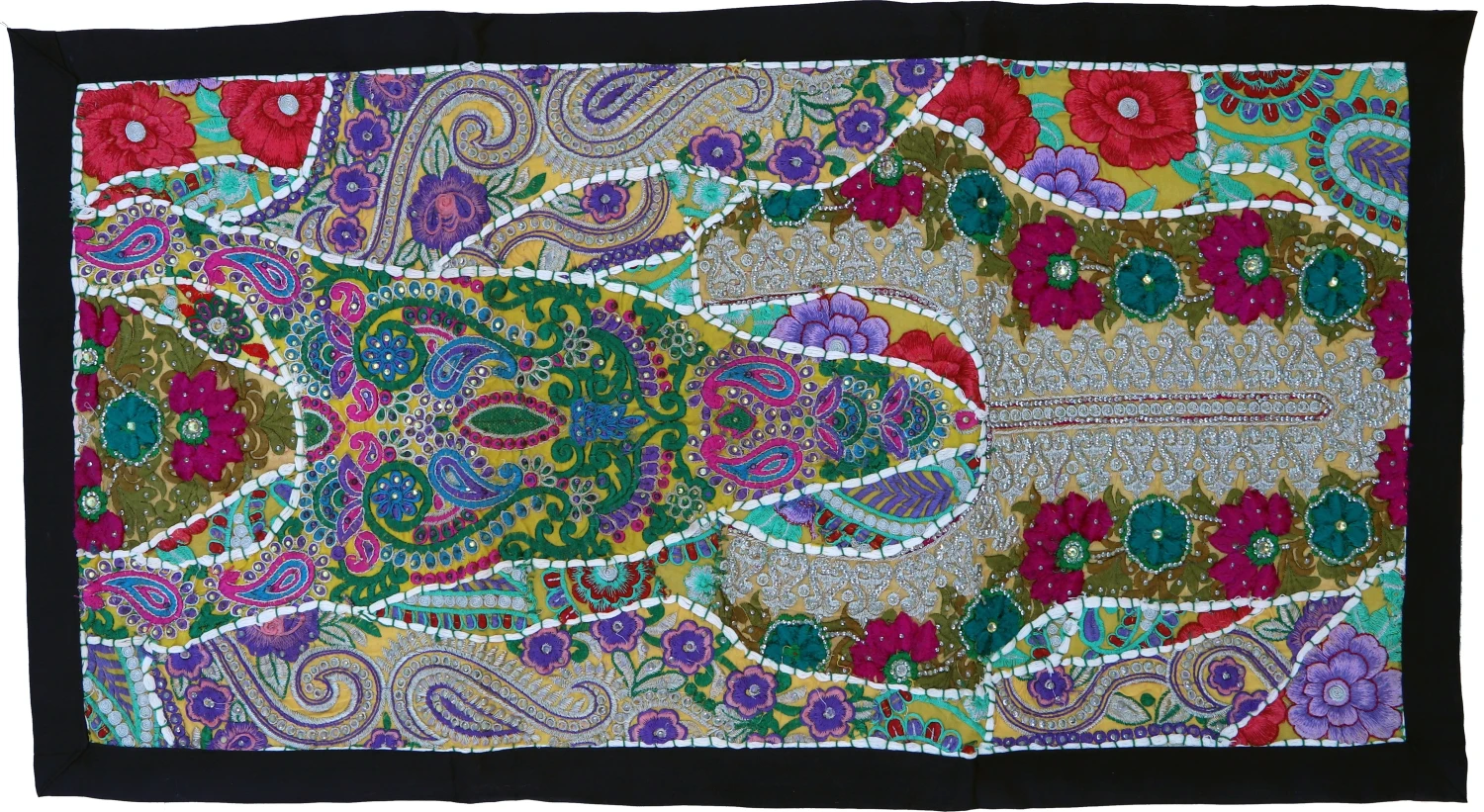 Dieser Patchwork Tischläufer ist ein Unikat und wurde aus alten Bordüren, Stickereien und Stoffverzierungen in Rajasthan gefertigt. Die Stoffstücke sind bis zu 50 Jahre alt, zum Teil mit Perlen und kleinen Spiegelchen bestickt, und wurden in liebevoller Handarbeit zu einer Teppichcollage verarbeitet. Mit diesem außergewöhnlichen orientalischen Wandbehang erwirbst Du ein einmaliges Stück nordindischen Kunsthandwerkes. Kleine Unregelmäßigkeiten in einzelnen Stoffapplikationen sind typisch für dieses Produkt und kein Mangel.