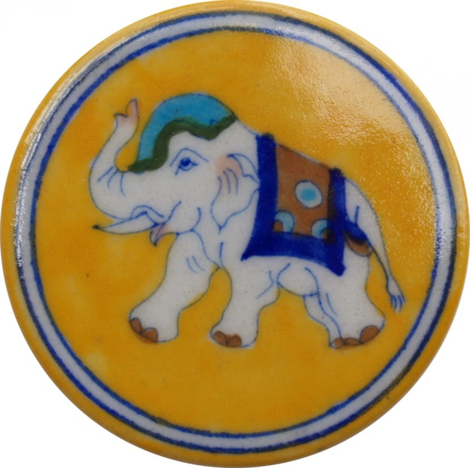 Handbemalter Keramikuntersetzer aus Indien, der auf der Unterseite mit Velours beklebt ist.