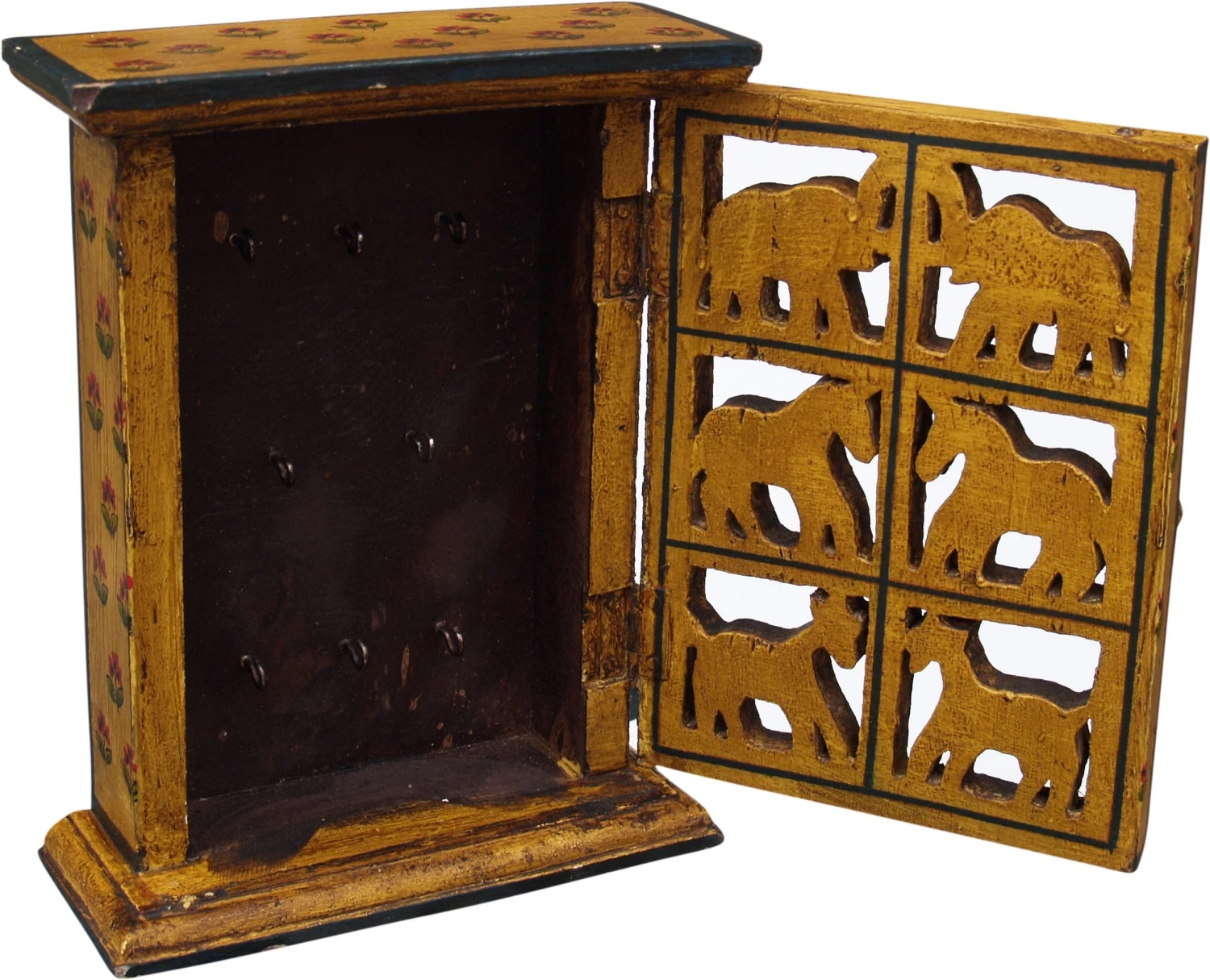 Hand bemalter Schlüsselkasten aus Shishamholz (Indien). An der Rückseite befinden sich zwei Ösen, an denen der Kasten an der Wand aufgehängt werden kann. Die bunten, handbemalten Schlüsselkästen aus Indien mit ihren traditionellen Motiven heben sich wohltuend von Schlüsselkästen aus Edelstahl ab. Nebst sauber aufgeräumten Schlüsseln, sind diese handgearbeiteten Stücke außerdem noch ein hübsches Dekoration Accessoire.