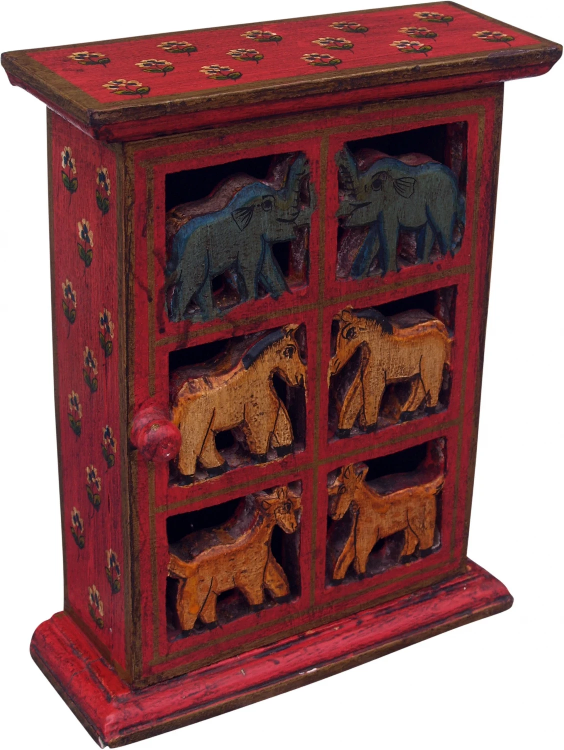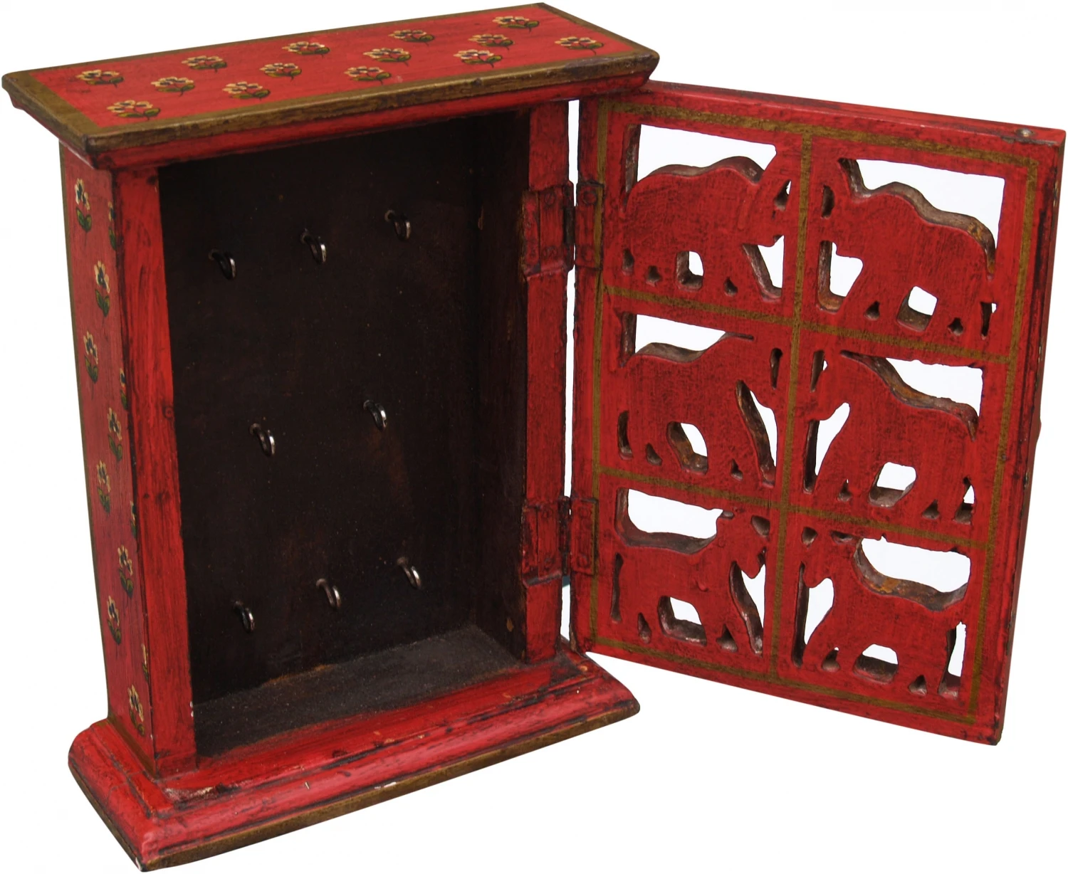Hand bemalter Schlüsselkasten aus Shishamholz (Indien). An der Rückseite befinden sich zwei Ösen, an denen der Kasten an der Wand aufgehängt werden kann. Die bunten, handbemalten Schlüsselkästen aus Indien mit ihren traditionellen Motiven heben sich wohltuend von Schlüsselkästen aus Edelstahl ab. Nebst sauber aufgeräumten Schlüsseln, sind diese handgearbeiteten Stücke außerdem noch ein hübsches Dekoration Accessoire.