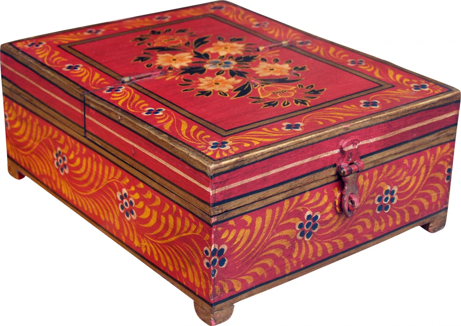 Praktische Schminkschachtel mit verstellbarem Spiegel und vielen Fächern. Die Motive der Bemalung sind verschieden und in dunkel gehalten. Jede Dose ist ein Einzelstück, es können Abweichungen bei der Bemalung auftreten.