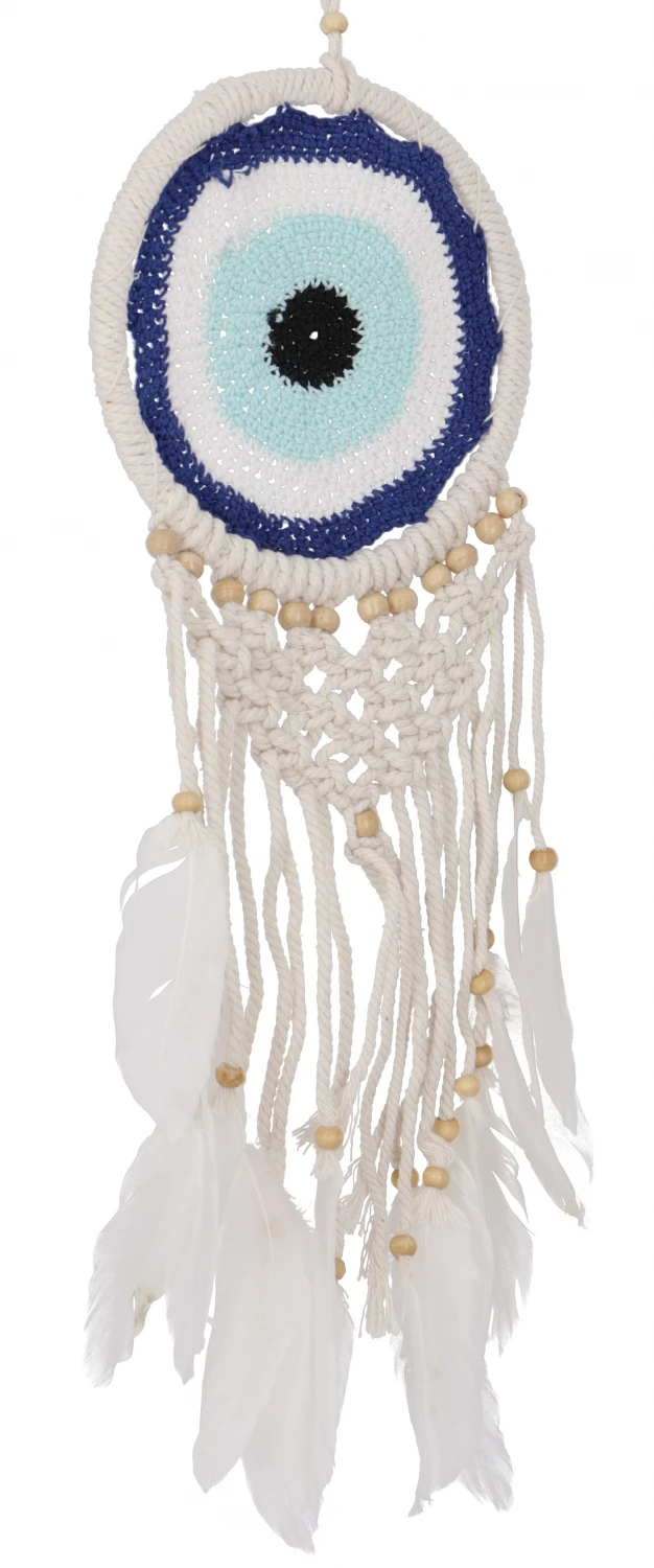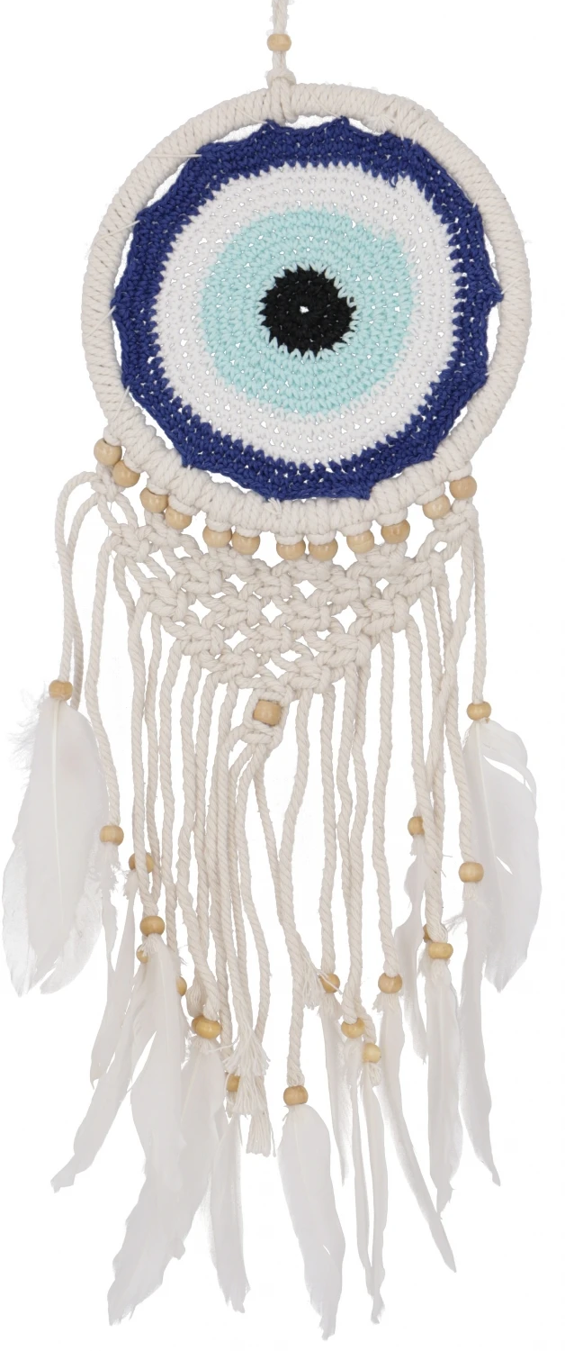 Schöner Traumfänger, gehäkelt in einem Design, welches an das „türkische Auge“ angelehnt ist.Traumfänger werden nach alter Weisheit über dem Bett aufgehängt, wo sie die bösen Träume in ihrem Netz einfangen. Die guten Träume hingegen schlüpfen durch das Netz hindurch und entweichen wieder ins Freie. Die Morgensonne neutralisiert alle bösen Träume, die im Netz des Traumfängers gefangen wurden. Traumfänger sind eine alte Tradition der Indianer Nordamerikas, werden aber von verschiedenen Überlieferungen umrankt.