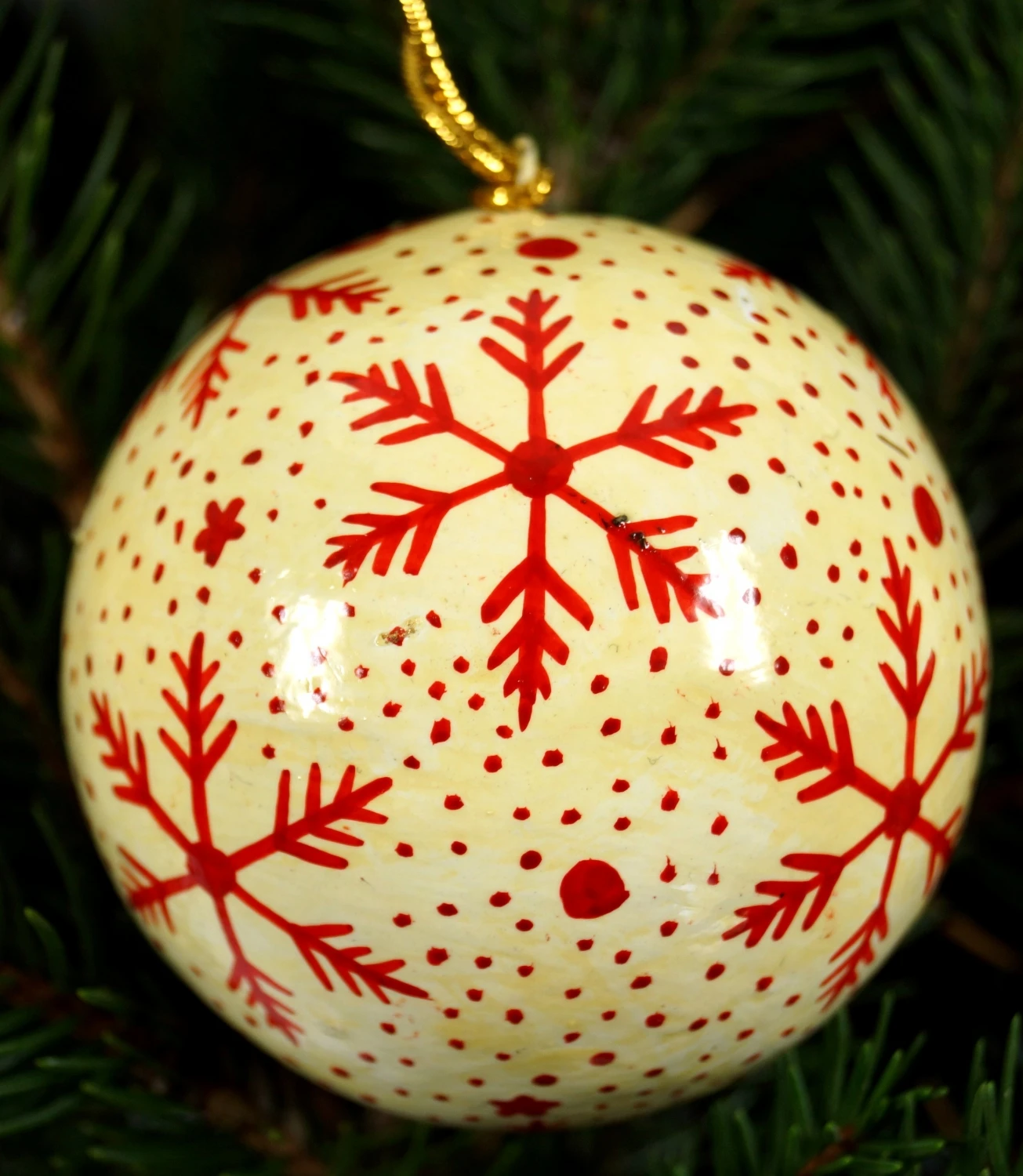 Traditionell werden in Kaschmir Dekorationsartikel aus Pappmaschee gefertigt. Dazu wird Altpapier in die wundervollsten Dinge verwandelt, so auch in diesen hübschen Christbaumschmuck. Diese schönen Weihnachtskugeln wurden extra für uns mit weihnachtlichen Motiven versehen.