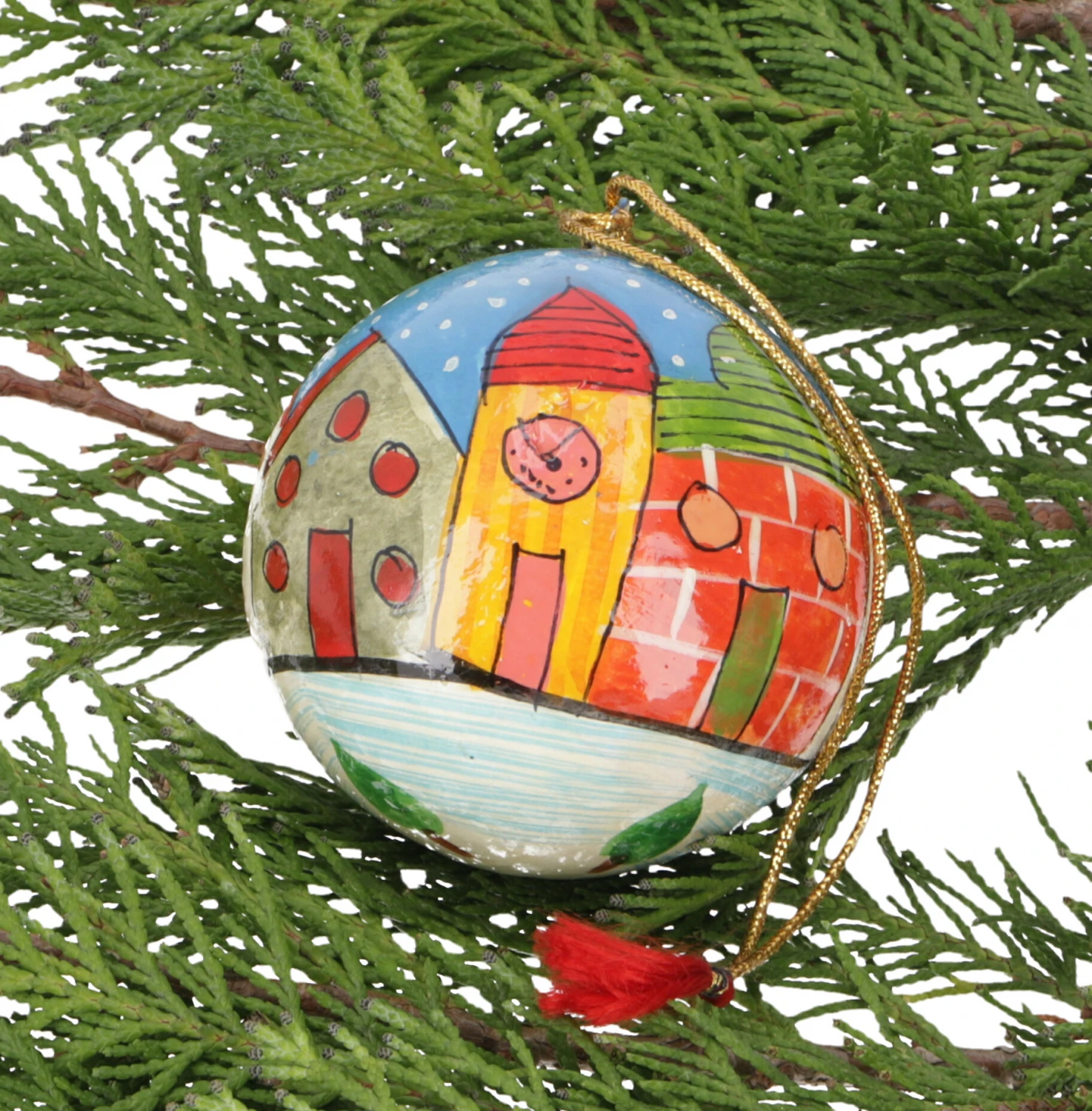 Traditionell werden in Kaschmir Dekorationsartikel aus Pappmaschee gefertigt. Dazu wird Altpapier in die wundervollsten Dinge verwandelt, so auch in diesen hübschen Christbaumschmuck. Diese schönen Weihnachtskugeln wurden extra für uns mit weihnachtlichen Motiven versehen.