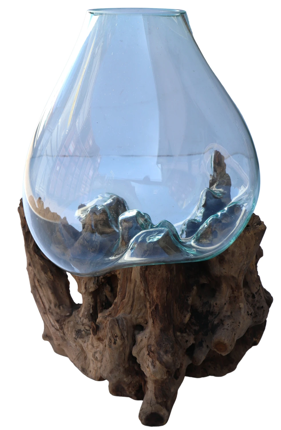Den Sockel bildet eine Wurzel aus Kaffeebaumholz. Das Glasgefäß aus Recyclingglas wird durch Erhitzen an die individuelle Form der Wurzel angepasst (dadurch erhält das Wurzelholz an dieser Stelle eine schwarze Patina). Jede Wurzel und auch jedes Glasgefäß fallen anders aus und machen diese Vase zu einem individuellen Einzelstück.