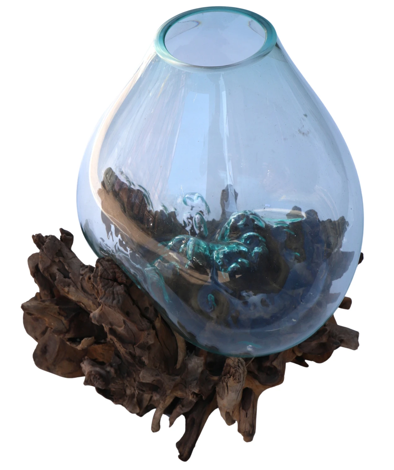Den Sockel bildet eine Wurzel aus Kaffeebaumholz. Das Glasgefäß aus Recyclingglas wird durch Erhitzen an die individuelle Form der Wurzel angepasst (dadurch erhält das Wurzelholz an dieser Stelle eine schwarze Patina). Jede Wurzel und auch jedes Glasgefäß fallen anders aus und machen diese Vase zu einem individuellen Einzelstück.