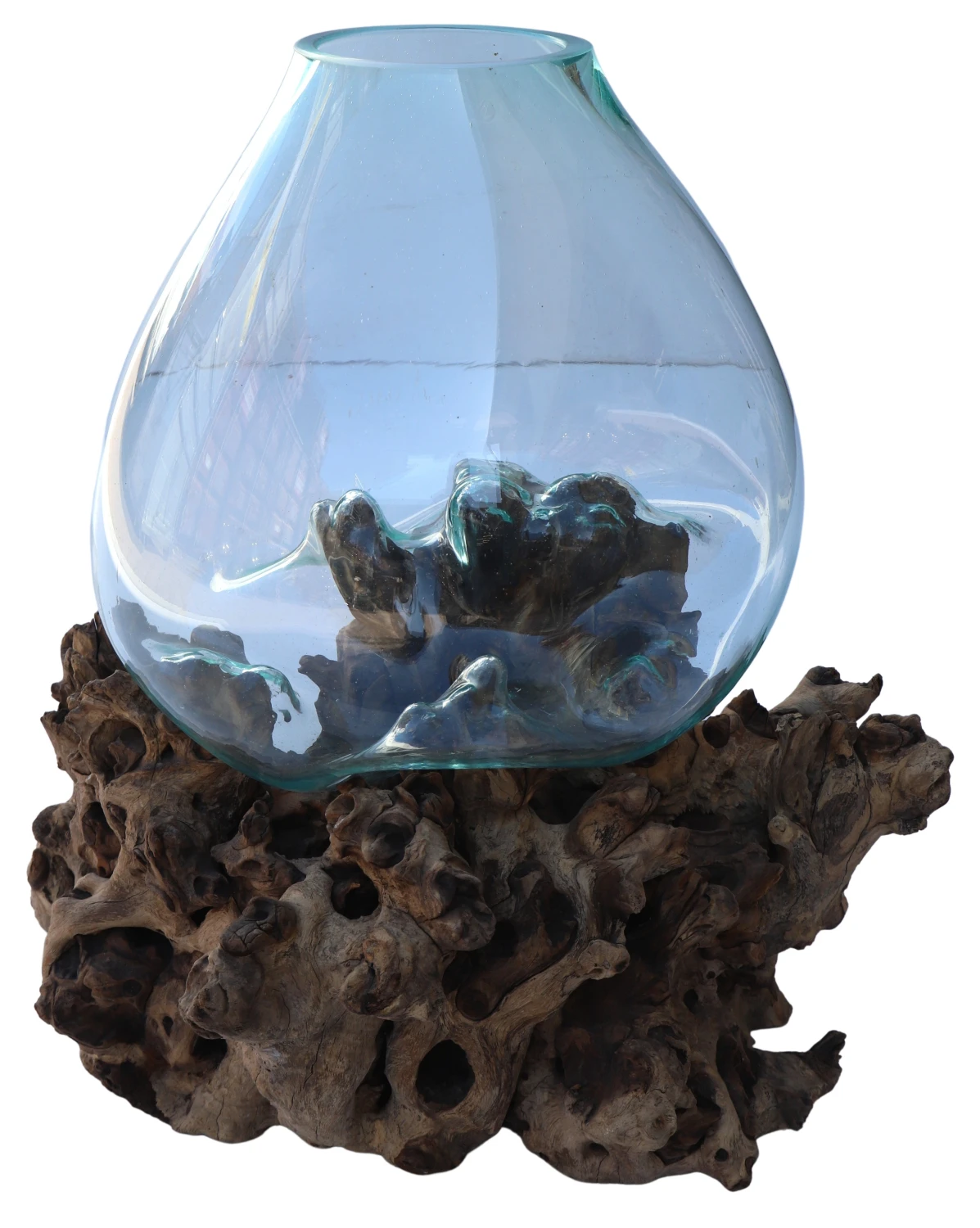 Den Sockel bildet eine Wurzel aus Kaffeebaumholz. Das Glasgefäß aus Recyclingglas wird durch Erhitzen an die individuelle Form der Wurzel angepasst (dadurch erhält das Wurzelholz an dieser Stelle eine schwarze Patina). Jede Wurzel und auch jedes Glasgefäß fallen anders aus und machen diese Vase zu einem individuellen Einzelstück.