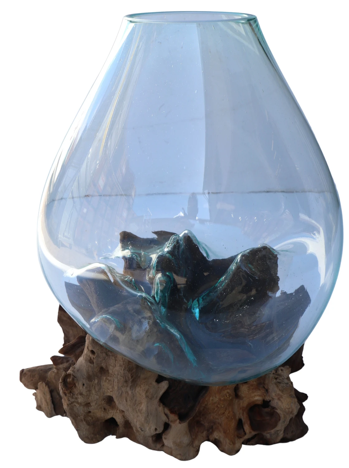 Den Sockel bildet eine Wurzel aus Kaffeebaumholz. Das Glasgefäß aus Recyclingglas wird durch Erhitzen an die individuelle Form der Wurzel angepasst (dadurch erhält das Wurzelholz an dieser Stelle eine schwarze Patina). Jede Wurzel und auch jedes Glasgefäß fallen anders aus und machen diese Vase zu einem individuellen Einzelstück.